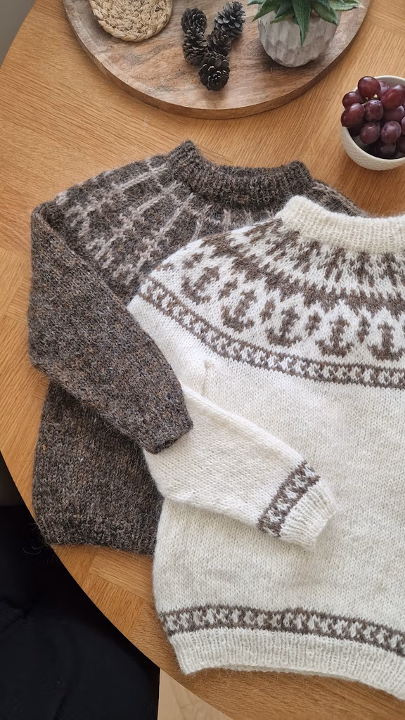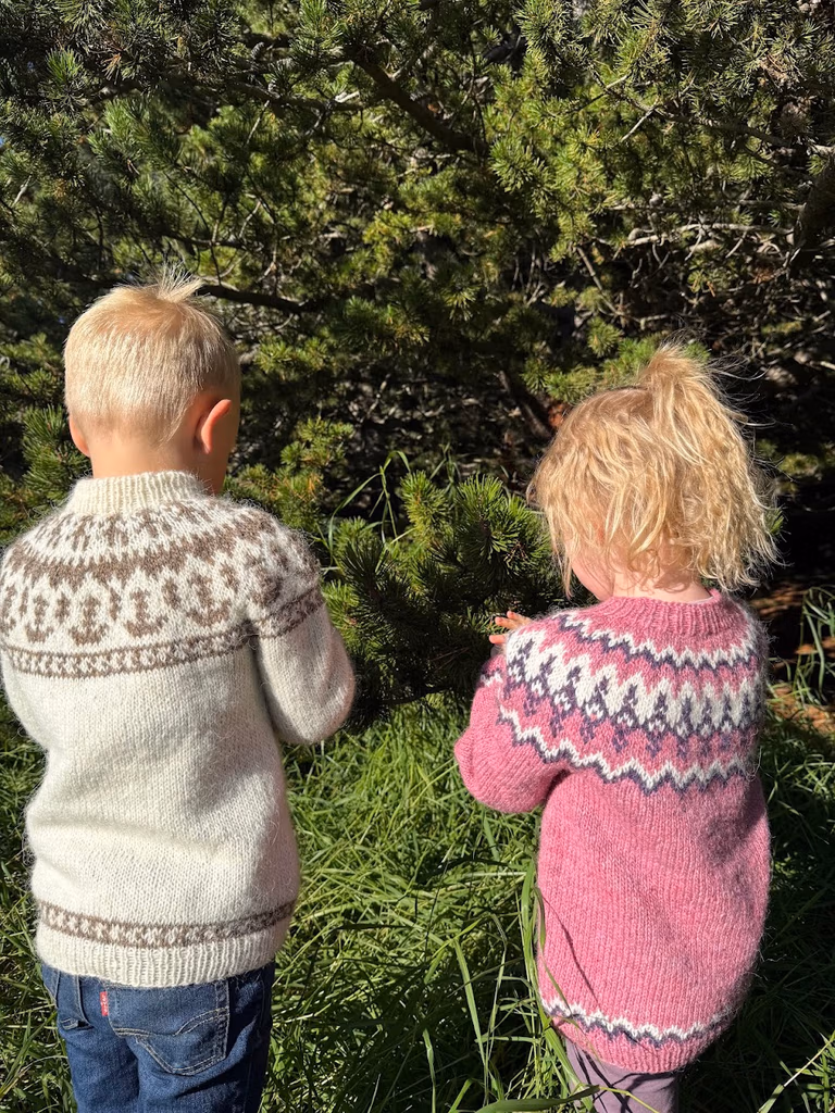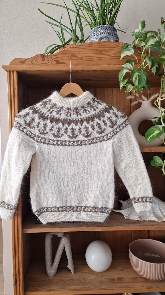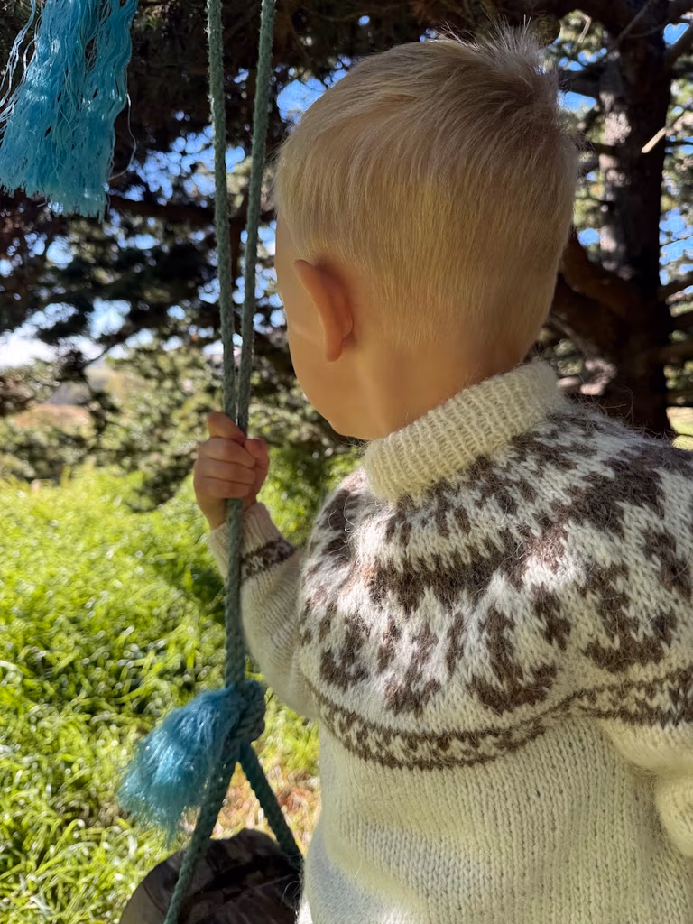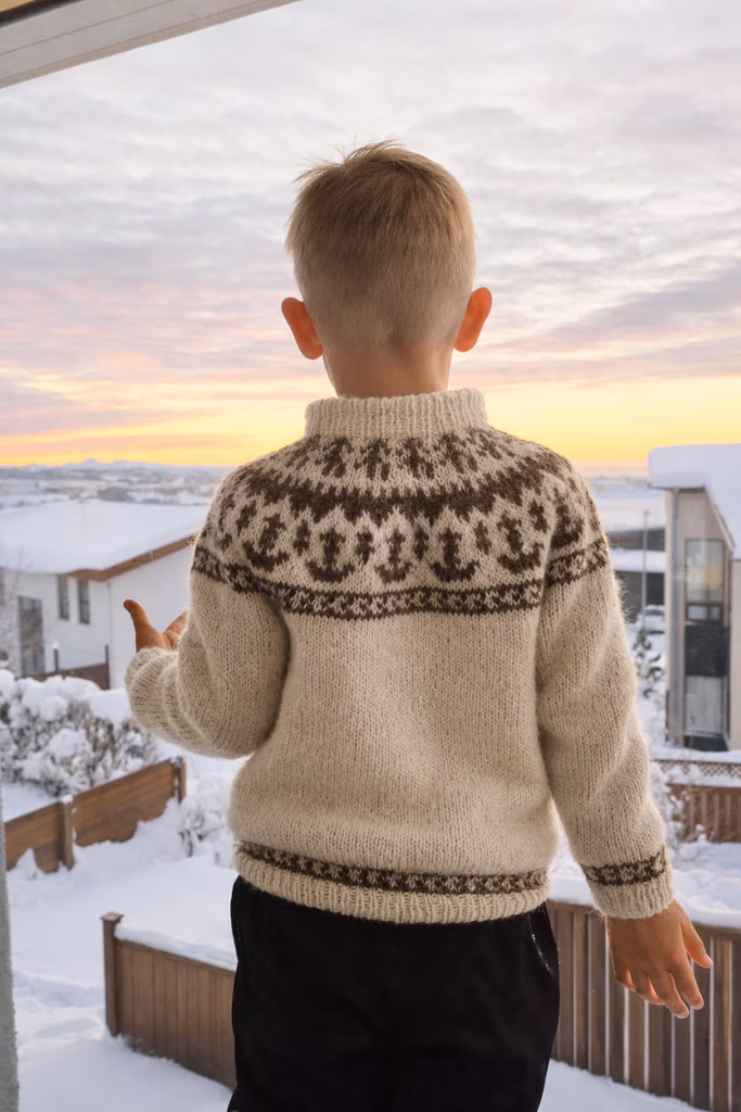 Naust pattern was originally designed to be a ‘viking ship’ pattern with runes, but most people see an anchor, so it can be whatever you like it to be. Naust lopapeysa is for kids ages 2-12 years old.